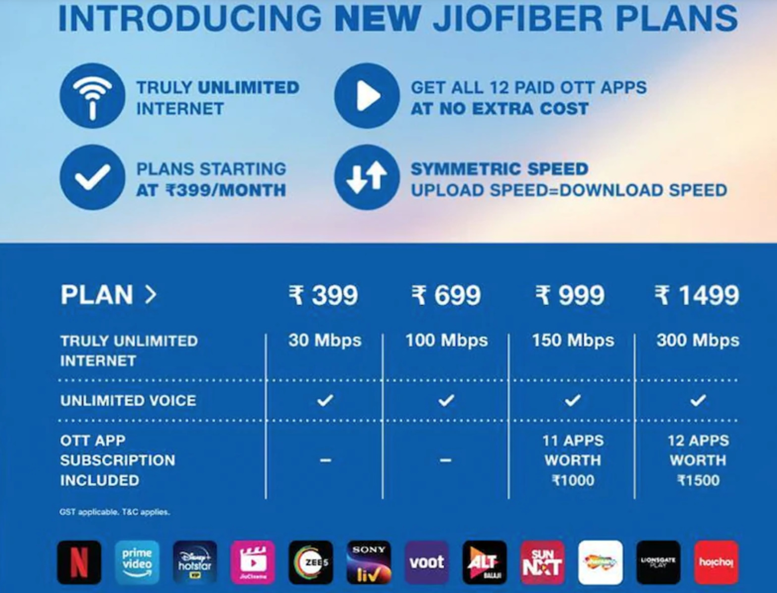999 രൂപ മുതൽ ആരംഭിക്കുന്ന പ്ലാനുകളിൽ 11 ൽ അധികം OTT പ്ലാറ്റ്ഫോമുകളും ലഭിക്കും.ജിയോ ഫൈബർ എടുക്കുന്നതിനായി വേണ്ട സെക്ക്യൂരിറ്റി ഡെപ്പോസിറ്റ് വെറും 1499 രൂപ മാത്രമാണ്.പുതുതായി ചേരുന്ന എല്ലാ ഉപഭോക്താക്കൾക്കും ആദ്യത്തെ ഒരുമാസം സെക്കൻഡിൽ 150 മെഗാബൈറ്റ്സ് വേഗതയിൽ പരിധിയില്ലാത്ത ഇൻ്റർനെറ്റും 10 ഒടിടി സേവനങ്ങളും സേവനങ്ങളും സൗജന്യമായി ലഭിക്കും.399 രൂപയുടെ ബേസിക് പ്ലാനിൽ 30 Mbps വേഗതയിൽ അൺലിമിറ്റഡ് ഇന്റർനെറ്റും വോയ്സ് കോളും ലഭിക്കും.പ്ലാനുകളിൽ ഏറ്റവും ആകർഷകം 999 രൂപയുടെ ഗോൾഡ് പ്ലാൻ ആണ്.ഈ പ്ലാനിൽ 150 Mbps വേഗതയിൽ പരിധിയില്ലാതെ ഇന്റർനെറ്റും വോയ്സ് കോളും ആസ്വദിക്കാം.കൂടെ 11 OTT പ്ലാറ്റ്ഫോമുകളും സൗജന്യമായി ലഭിക്കുന്നു.